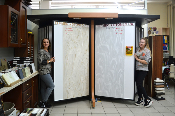 Компания «Гермес» установила единственный в России стенд-экспозитор с большими образцами искусственного камня Corian® DuPont в центральном офисе на Комендантском пр., 4, Санкт-Петербург.